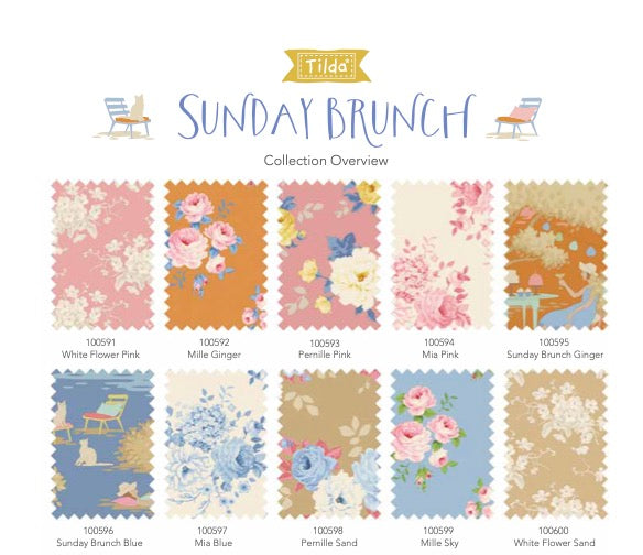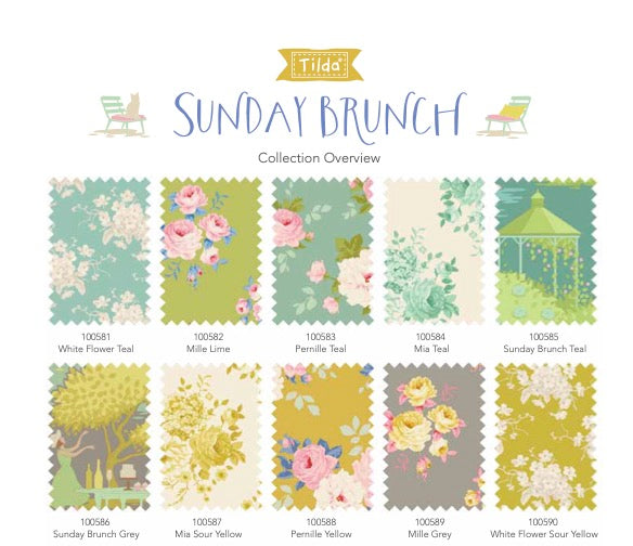 The Sunday Brunch Collection Fabric Stack includes 40 10in x 10in pieces of fabric- 2 of each of the main collection Tilda Fabric's Sunday Brunch, designed by Norwegian designer Tone Finnanger, is a softly colored vintage collection, where she has dusted off and renewed a few old romantic floral Tilda patterns. These are combined with a Sunday Brunch motif depicting friends sharing a lovely, laid-back brunch in the garden. The color palette is gentle but with a dash of sour for freshness, with colors ranging from teal, green, soft greys and yellows to ginger, pinks, blues and sand. The sweet Tipsy blenders complement the main collection perfectly.